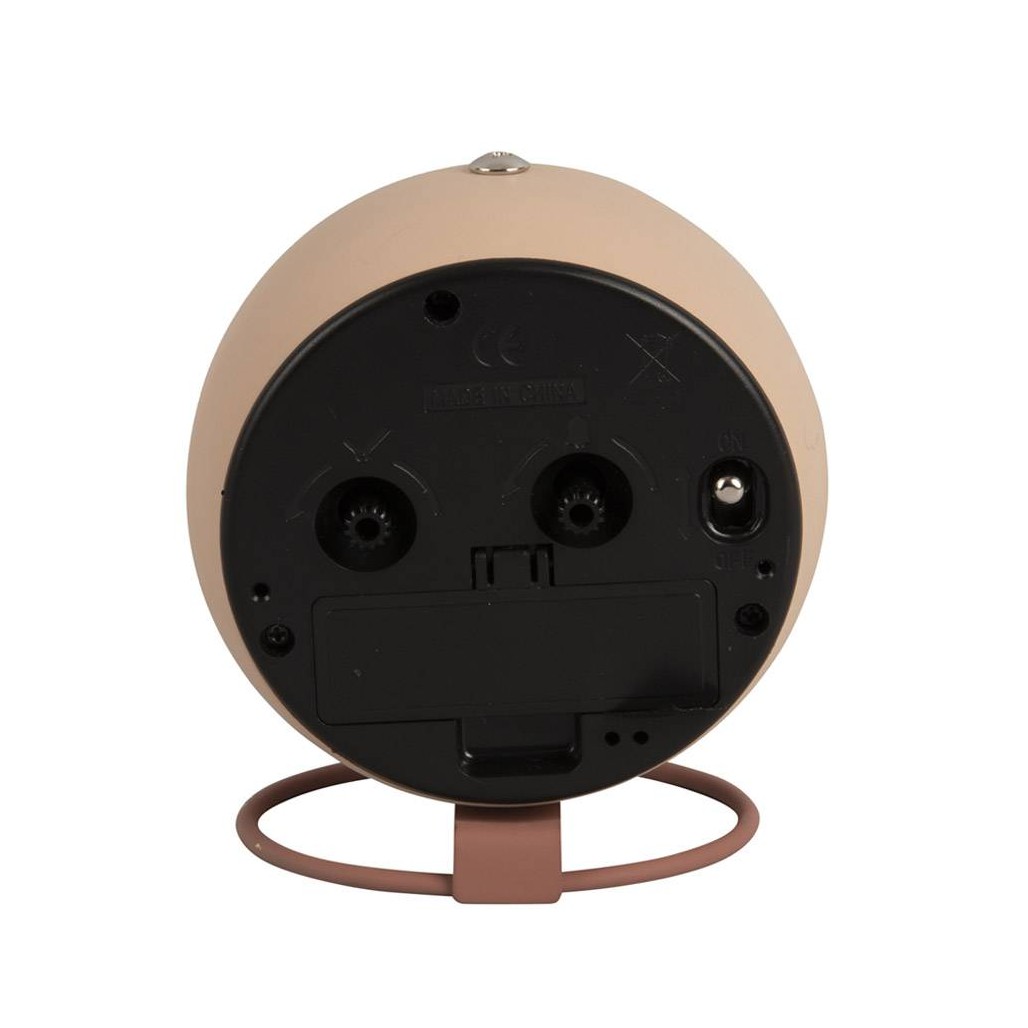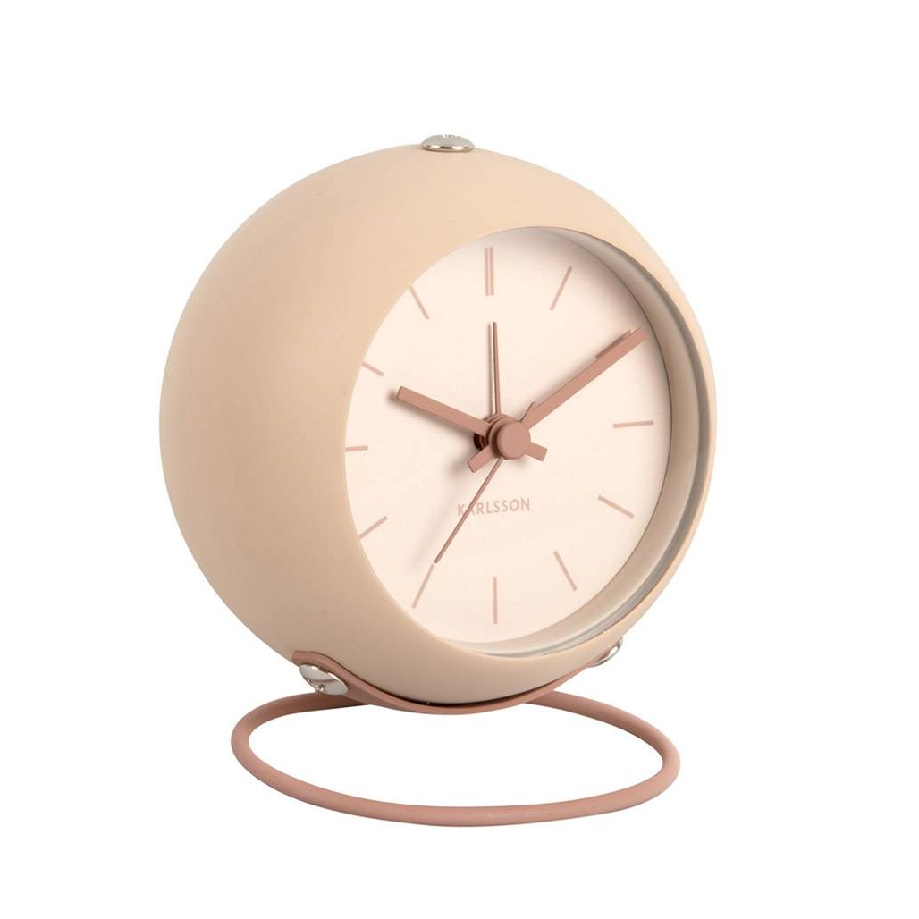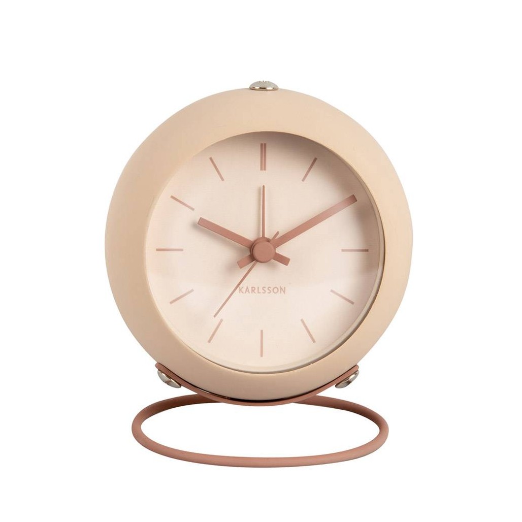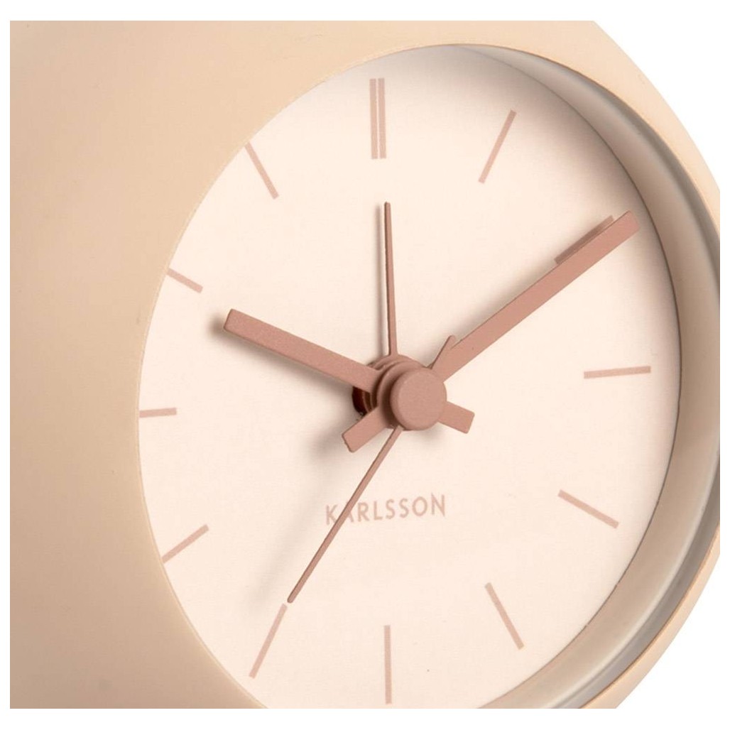 Kauniisti muotoiltu herätyskello Karlssonilta. Kellon hiekanvärinen kotelo sopii upeasti harmaaseen jalustaan. Kellossa on äänetön liike.