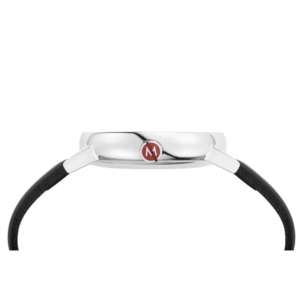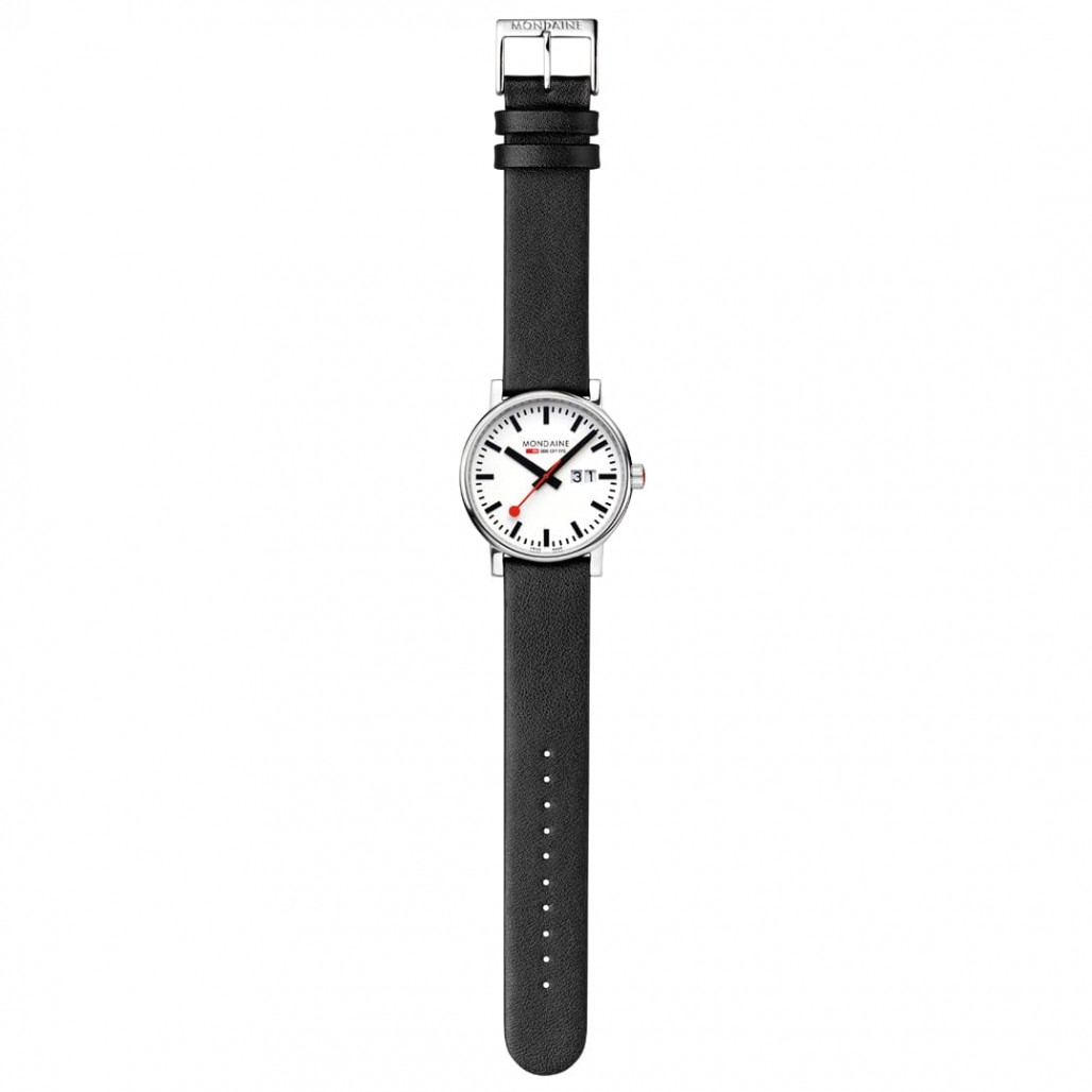 Harmonisesti muotoiltu, kiillotetusta ruostumattomasta teräksestä valmistettu runko Mondaine Official Swiss Railways evo2 -kellossa takaa maksimaalisen käyttömukavuuden. Tämän klassisen kellon ikoninen muotoilu näkyy helposti luettavassa kellotaulussa, jota täydentää suuri päivämääränäyttö. Kellossa on musta vegaaninen nahkaranneke. Ranneke koostuu 75 % kasvipohjaisesta ekokomposiitista ja 25 % kierrätetystä PET-materiaalista.