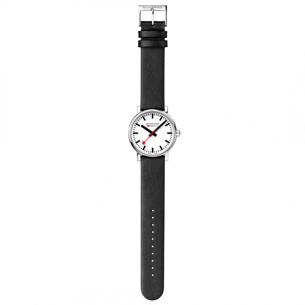 Mondaine Official Swiss Railways evo2 -kellon harmonisesti muotoiltu runko on valmistettu kiillotetusta ruostumattomasta teräksestä ja tarjoaa maksimaalisen käyttömukavuuden. Klassinen kello erottuu helposti luettavalla 40 mm kellotaululla, jota suojaa naarmuuntumaton safiirilasi. Ergonominen punainen kruunu ja elegantti musta vegaaninen nahkaranneke viimeistelevät muotoilun.